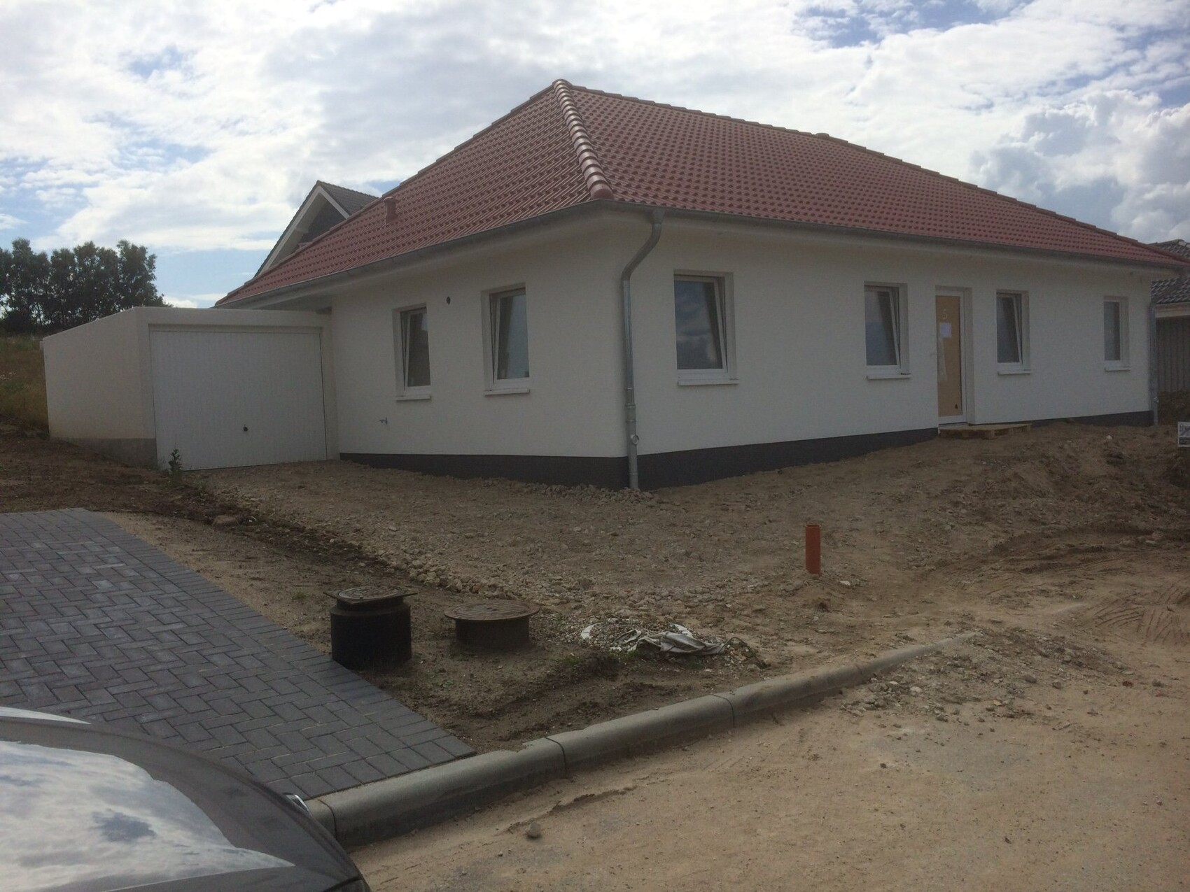 Weißes Einfamilienhaus mit rotem Ziegeldach, Garage links, unbefestigte Baufläche.