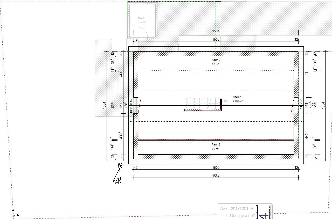 - Offener und geschlossener Abstellbereich könnten mit einer steilen geraden Treppe ersetzt werden (angedeutet im DG-Grundriss). Der Straßenrolli würde dann immer noch Platz unter der Treppe finden und für den Rest müsste man neu überlegen. Man könnte aber unter dem Dach noch etliche qm erschliessen, sollte es z. B. mit der Familienplanung wie gewünscht weitergehen. Den Deckenausschnitt würde ich also auf jeden Fall einplanen.