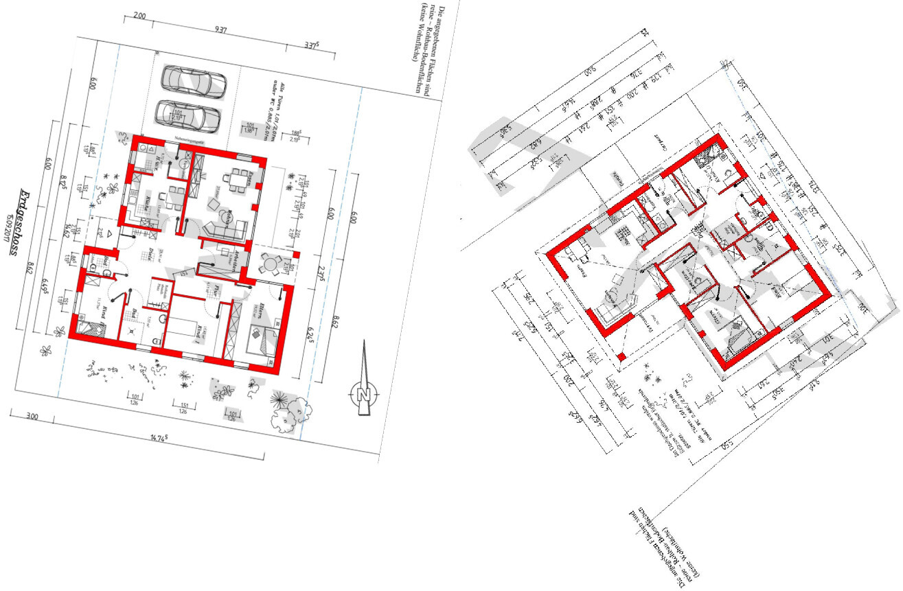 Der Architekt hat wohl irgendwie ein gespaltenes Verhältnis zum Grundstück, ich habe den alten und den aktuellen Entwurf mal gleichorientiert (beide genordet) nebeneinandergelegt: