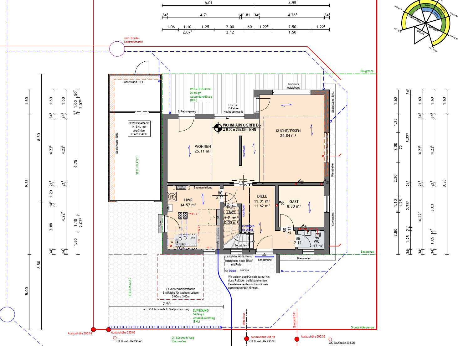 Der Hauswirtschaftsraum wurde umgeordnet und hat erst mal ein Fenster erhalten - auch wenn das im Plan etwas Wandfläche klaut und ich mit dem Versorger final klären muss ob die sich dran stören (manche tun das wohl), ich würde es gern drin haben. Vor der Außentür ist nun eine Stufe eingezeichnet, da es 35cm Höhenunterschied bis zum Fertigfußboden hat. Bin nicht sicher ob die mich stört oder nicht - aber das ist ein Detail für die Ausführung später, jetzt kann es erst mal gezeichnet bleiben.
