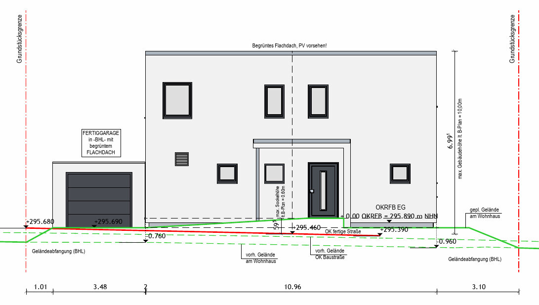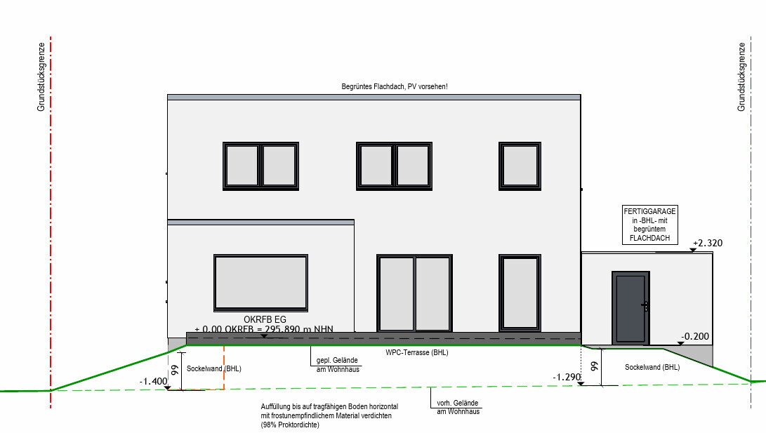 Modernes Haus mit begrünter Flachdachfläche, PV vorgesehen, Fensterfronten und Garage rechts.