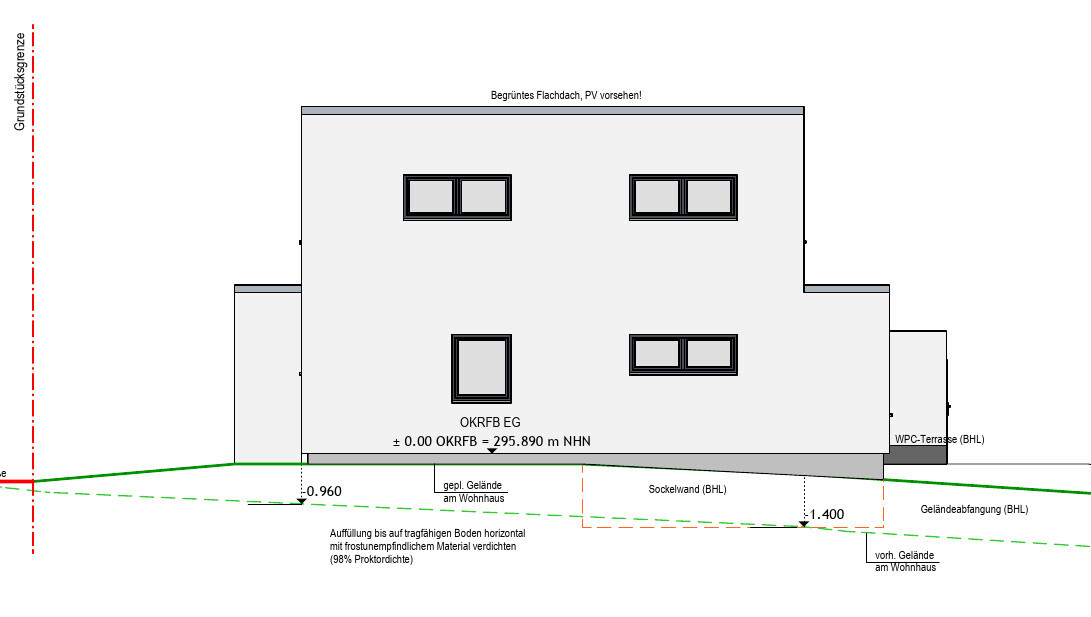 Projektzeichnung eines modernen Flachdach-Wohnhauses mit Fenstern, Gelände- und Höhenlinien.
