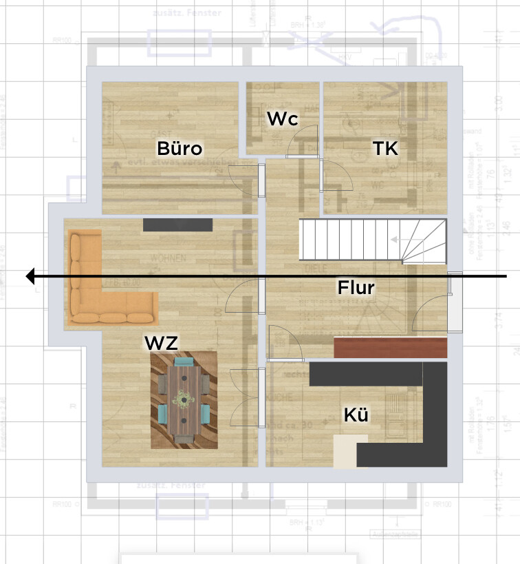Hier mit Eurer Ausrichtung der Räume… nicht irritieren lassen von der Spiegelung