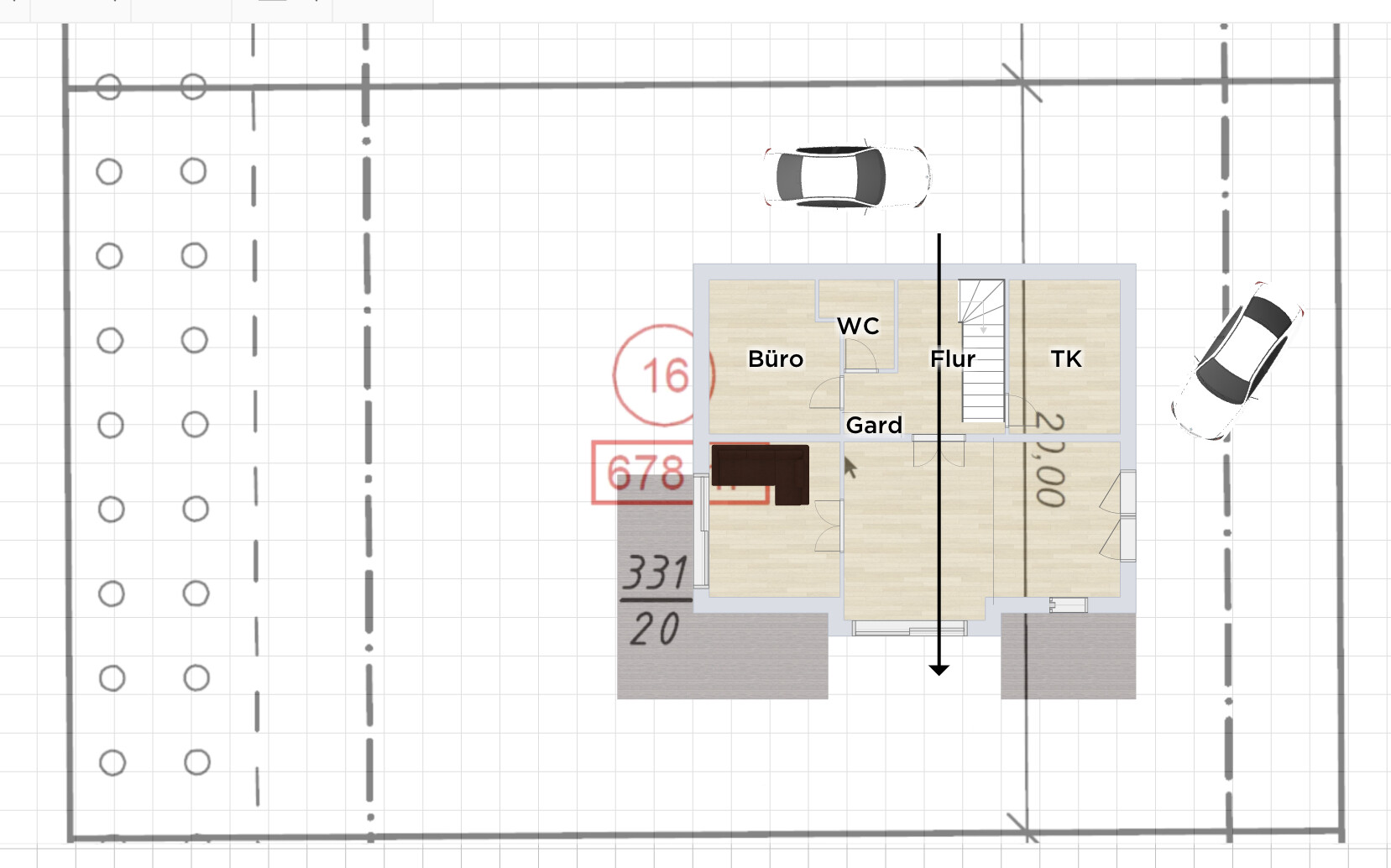 Wenn man mit dem Grundstück planen würde, würde wohl diese Hausausrichtung rauskommen: