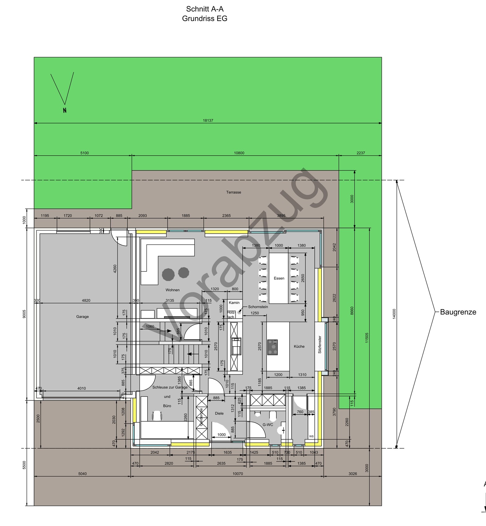 Grundriss EG mit Terrasse, Gartenfläche und Wohn-, Ess- und Küchenbereich.