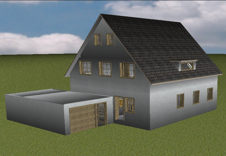 Zweistöckiges Haus mit Garage, graue Fassade, Satteldach und mehreren Fenstern auf grünem Rasen