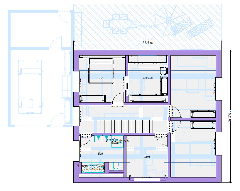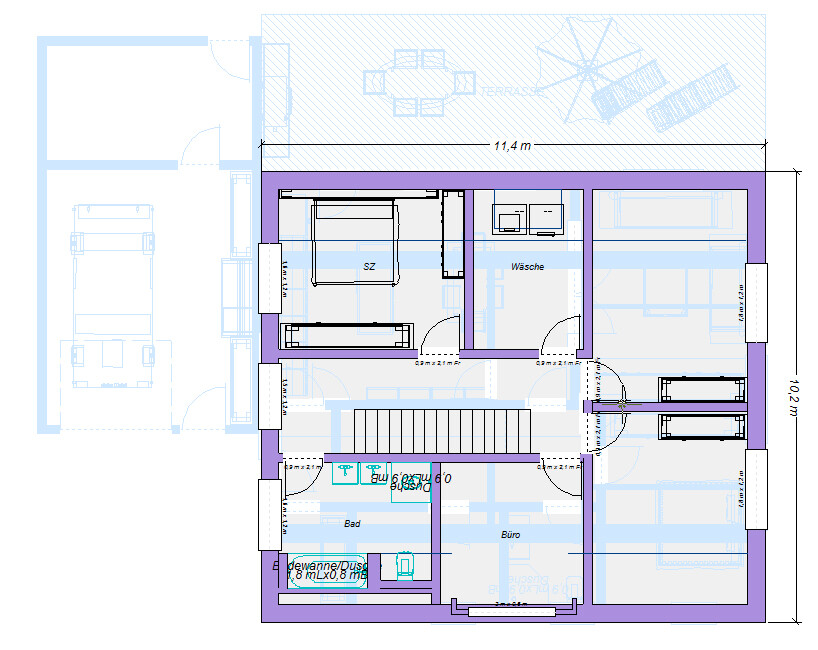 Hier die Option mit der Treppe horizontal zum Plan. Ich habe dem Haus mal mehr Tiefe gegeben und dafür in der Breite geschrumpft.