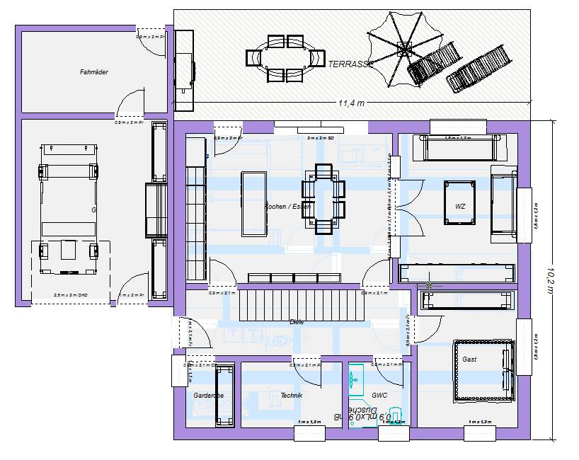 Grundriss: Terrasse mit Esstisch; links Fahrradraum; Küche, Essen, Gast, Technik, Garderobe.