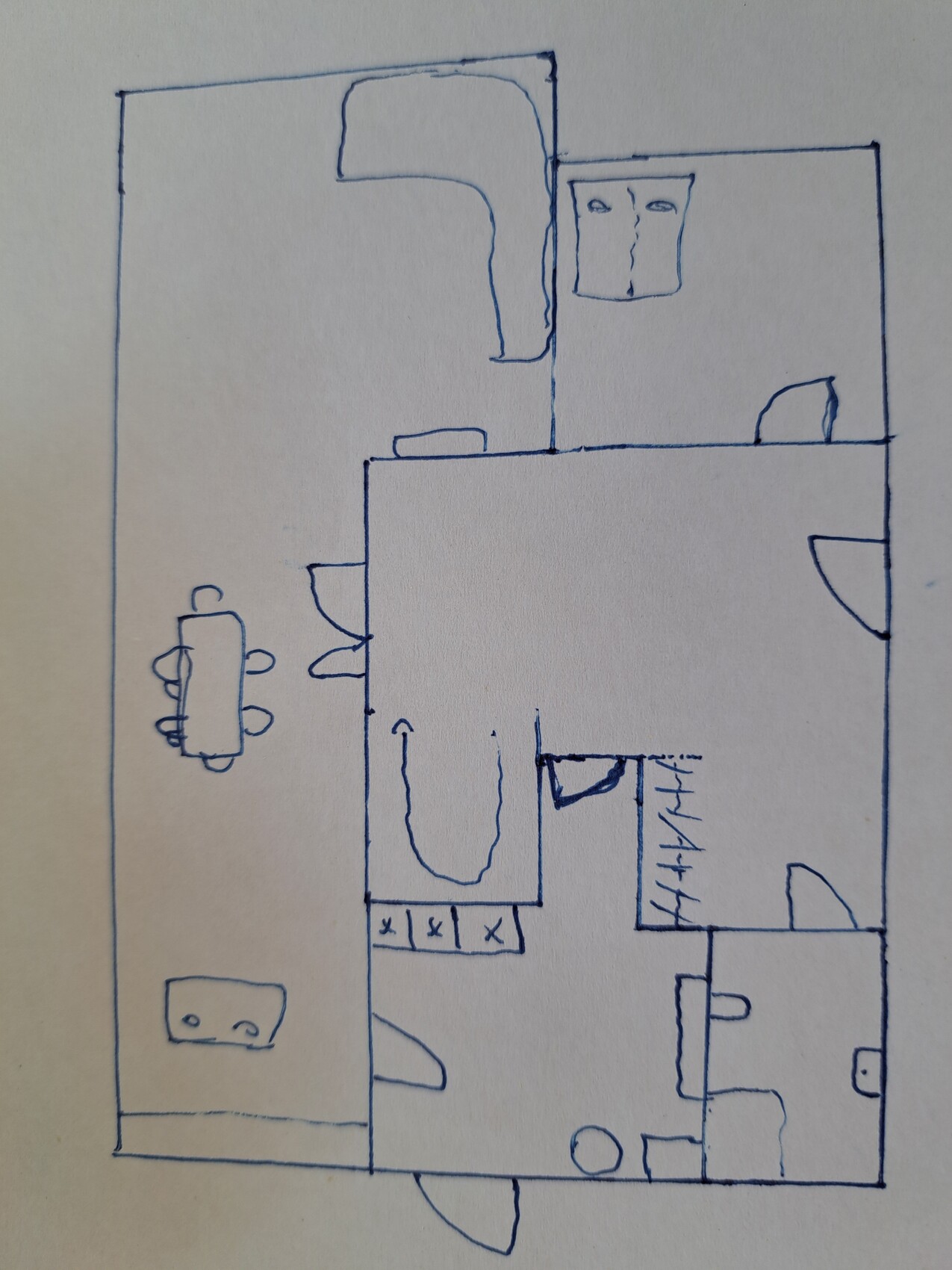 hier mal mein Vorschlag, allerdings nur als Skizze zu sehen. Die Treppe müsste vergrößert werden und gespiegelt, die Pappwände angepasst.