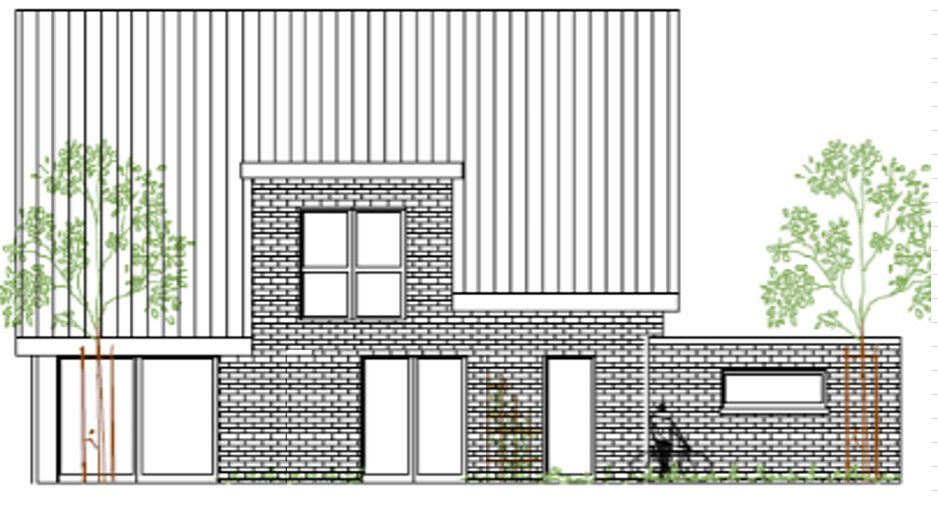 Architekturzeichnung eines modernen Backsteinhauses mit Flachdächern, Fenstern und Bäumen.