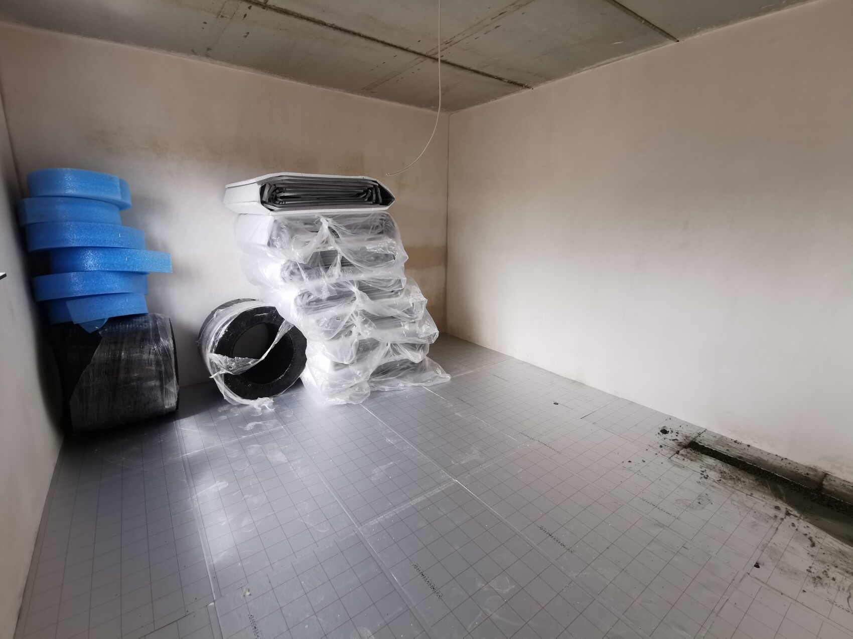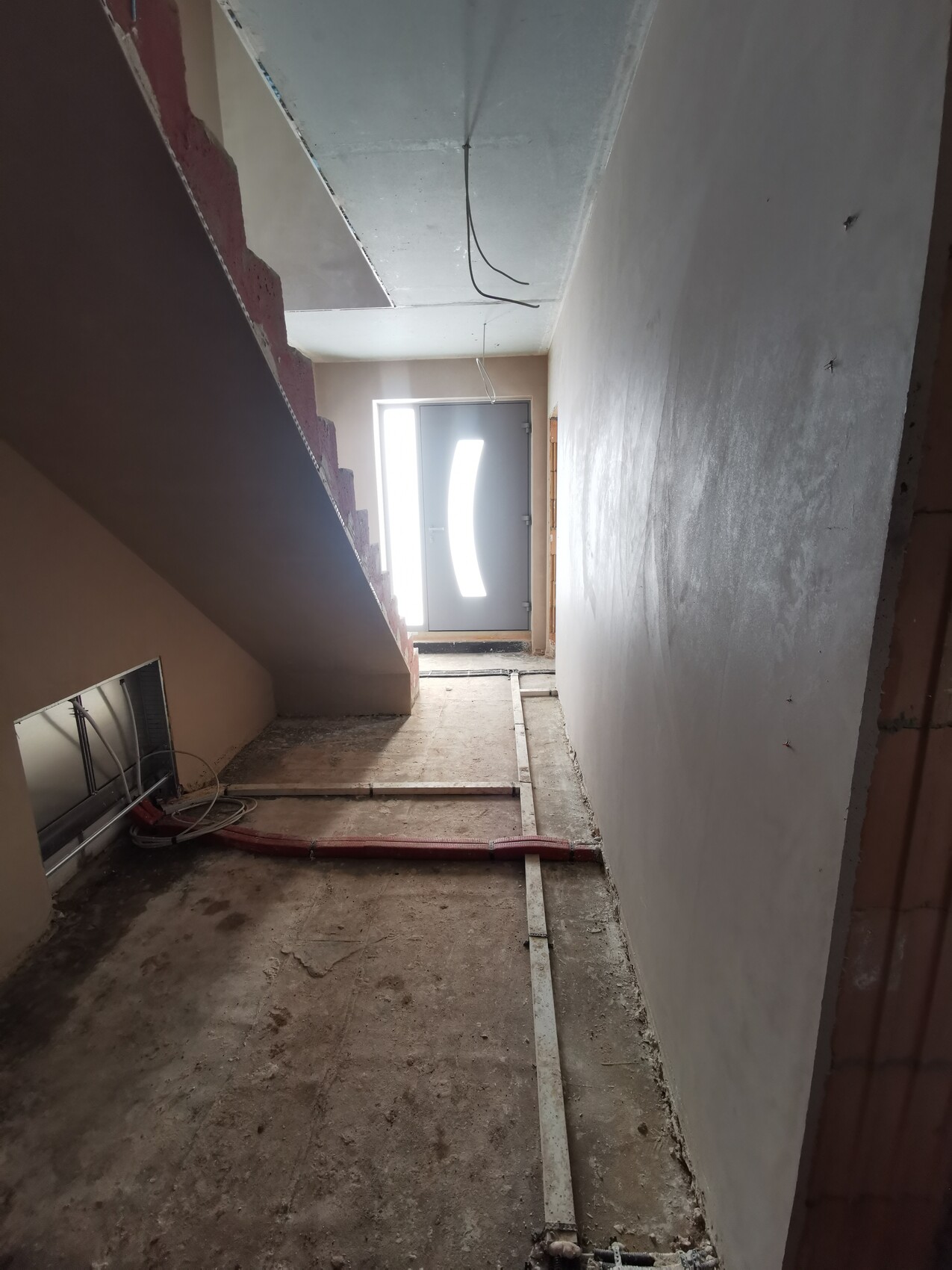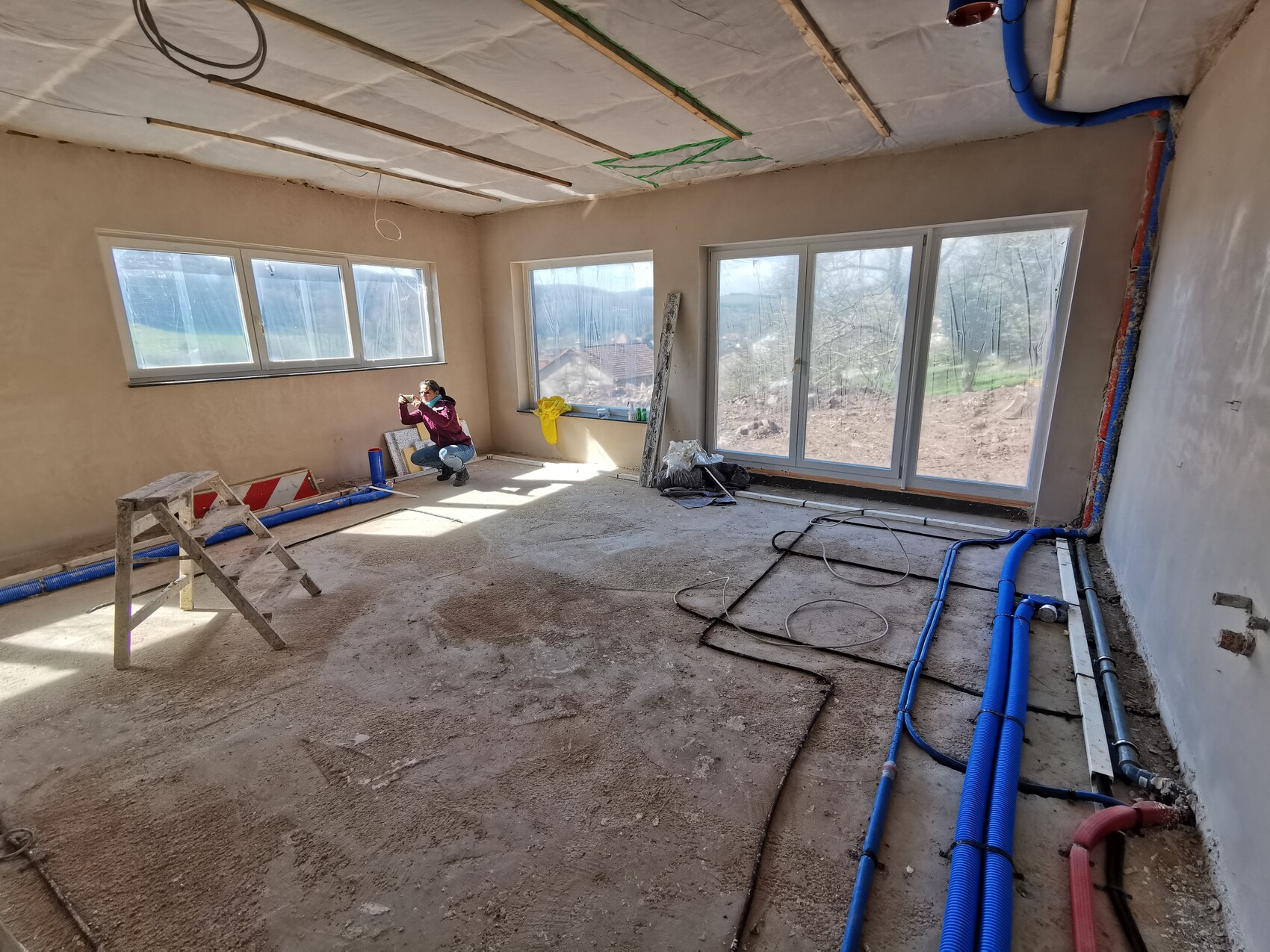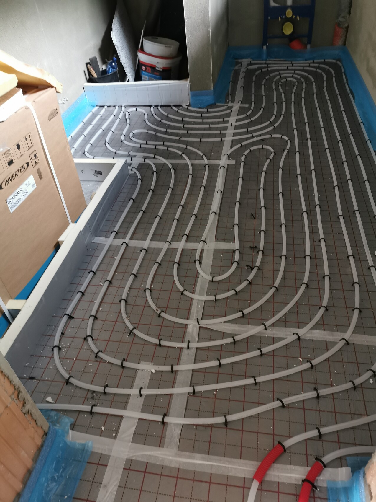 Anfang April wurde die PUR Bodendämmung sowie die Fußbodenheizungsmatten eingebracht. Anschließend der Zementestrich.