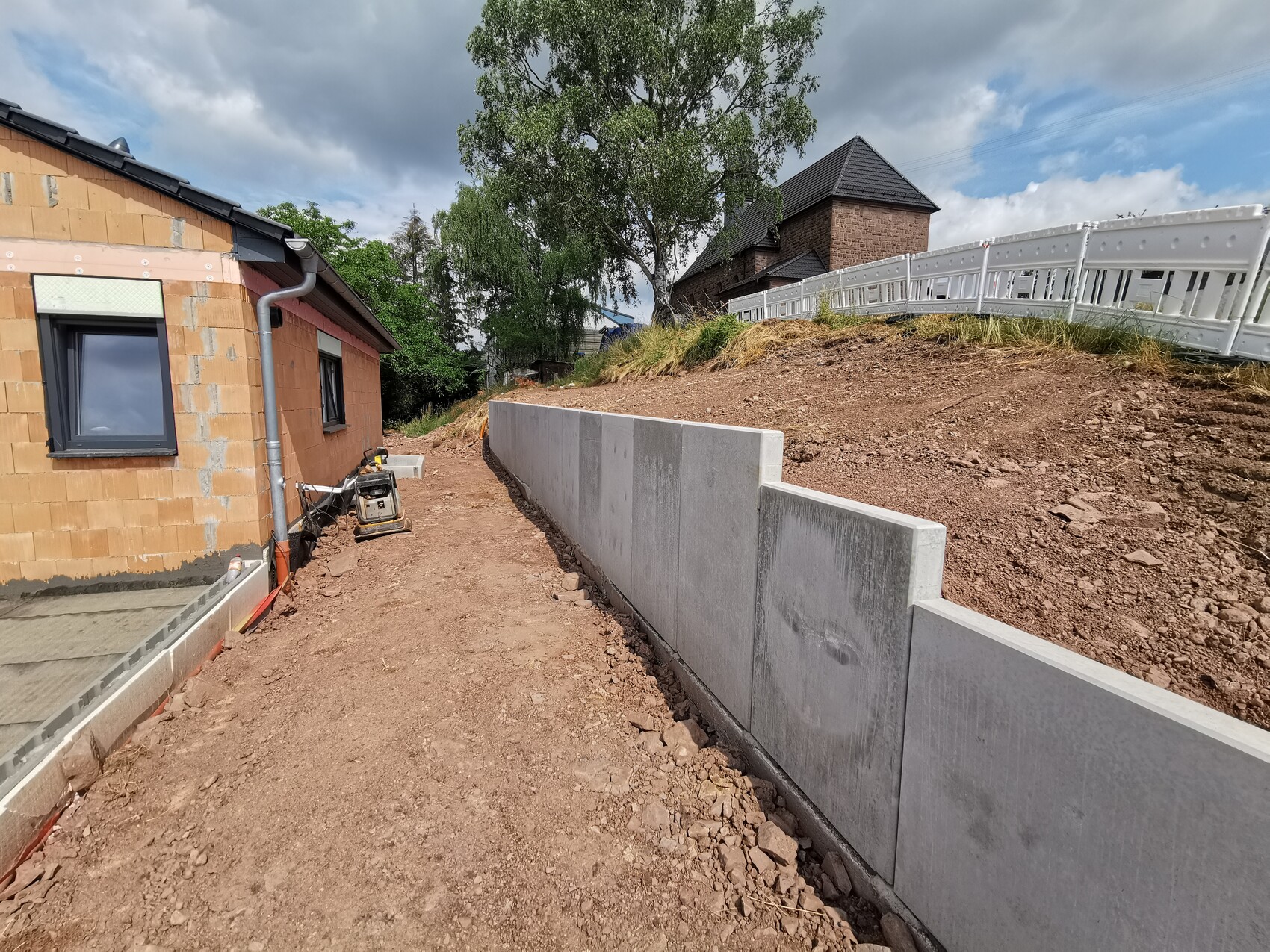Draußen konnten wir zeitgleich an der Garage weiter basteln und die Hangabsicherung hinterm Haus mit L-Steinen realisieren.