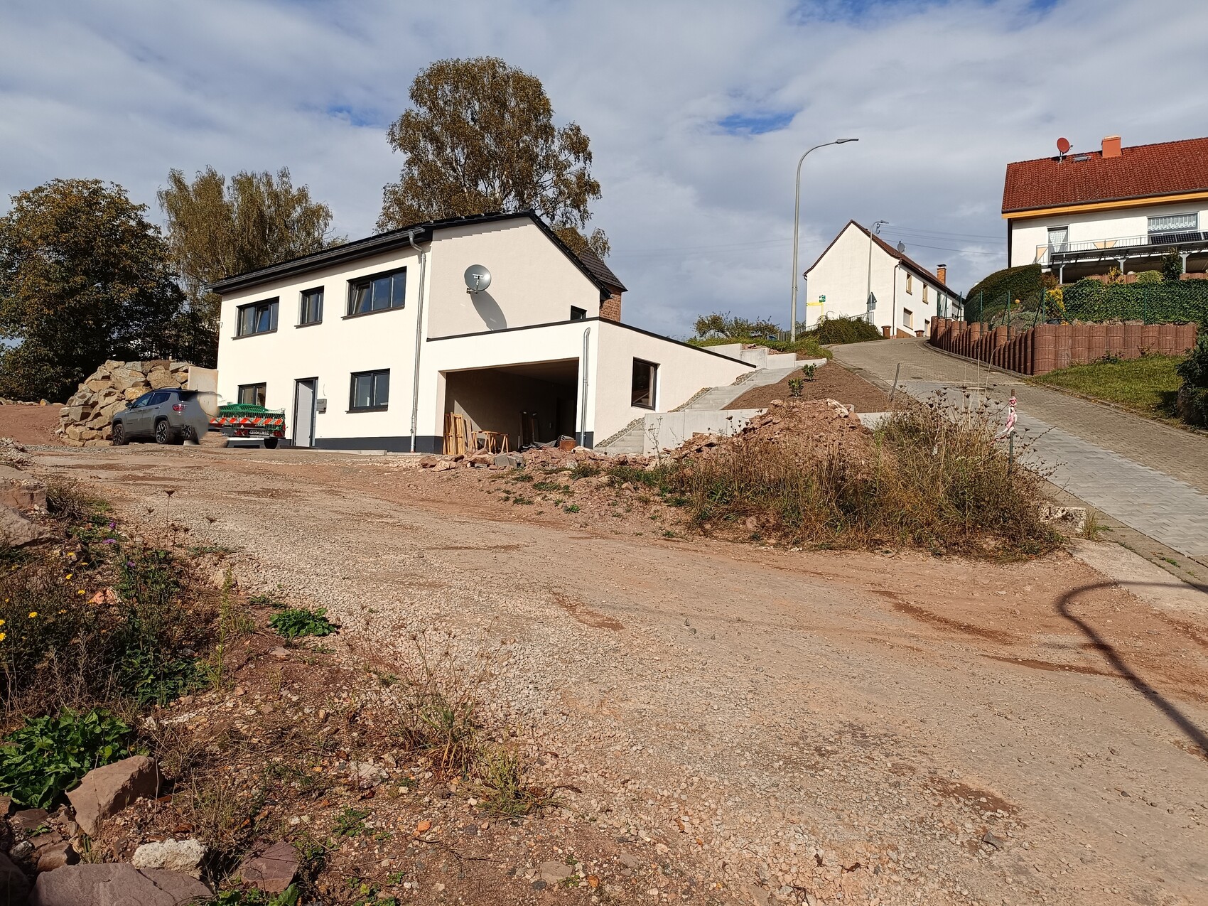 Die Hangsicherung rund ums Grundstück und Haus wird mit Granitblöcken im Sichtbereich und L-Steinen zu den Grundstücksgrenzen hin gesichert. Leider lassen sich diese Kosten nicht in die Zukunft verschieben und müssen nach und nach zeitnah realisiert werden. Hoffentlich hält sich der Aufwand in Grenzen.