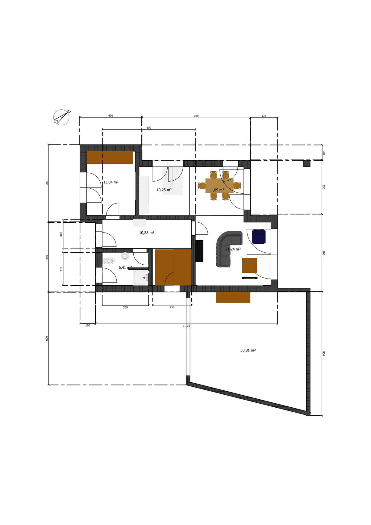 Grundriss eines Hauses mit mehreren Zimmern, Türen und braunen Markierungen; Flächenangaben in m².