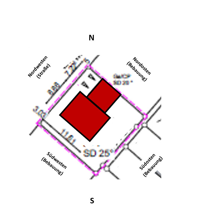 Lageplan: Zwei rote Baukörper auf einem Grundstück, Nord oben, umliegende Bebauung.