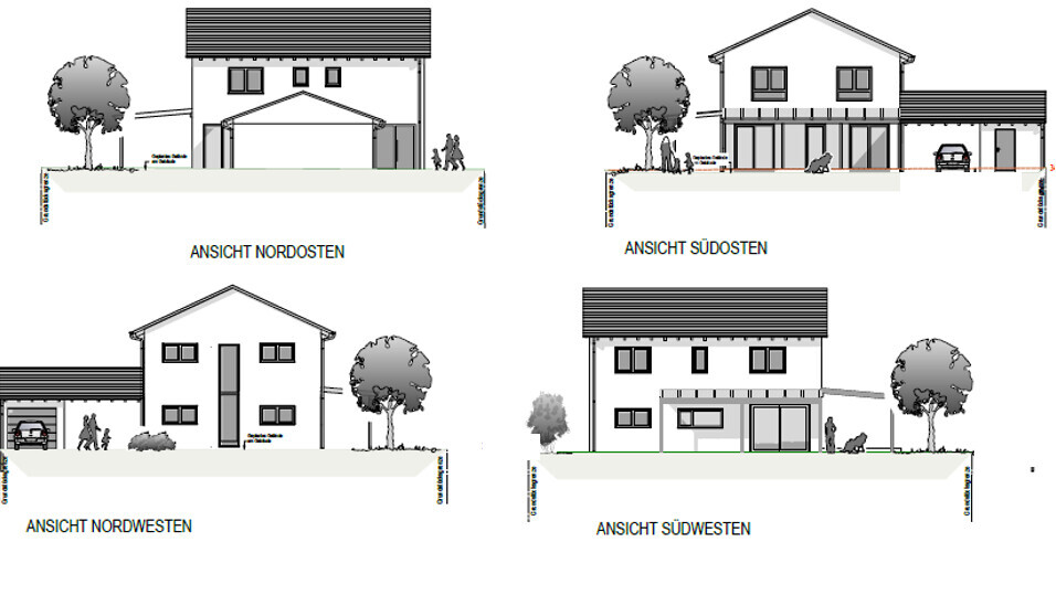 Vier Ansichten eines Hauses mit Garage, Garten und Bäumen - Nordost/Südost/Nordwest/Südwest
