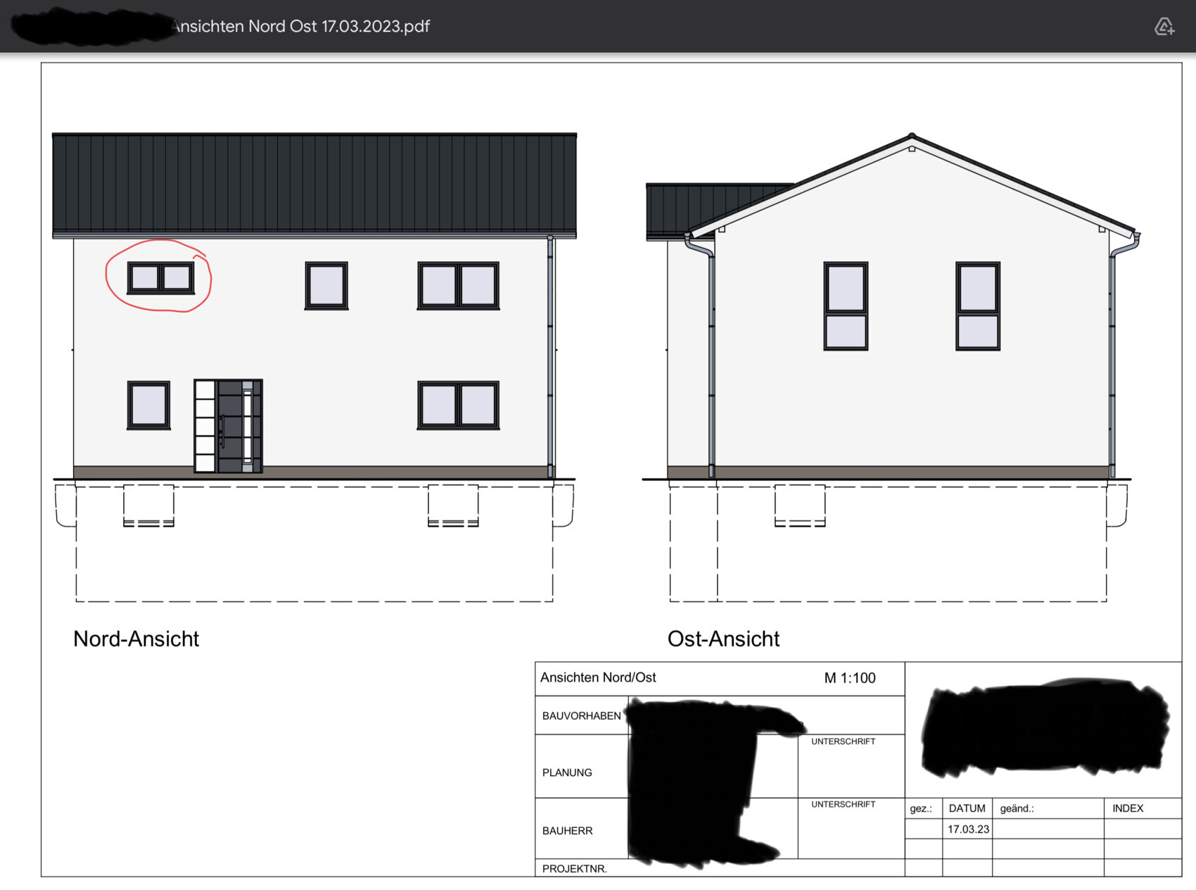 1. Fenster im Schlafzimmer zur Nordseite. Es gibt 3 Vorschläge… Einmal „Vorschlag_1“, dann „Vorschlag_2“ und wie bisher (siehe „Nord OST Ansicht.png“). Was würdet ihr wählen? Siehe roter Kreis.