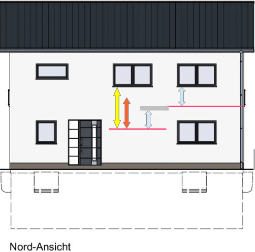 Ich habe jedenfalls mal den Schäng Pütz gespielt und Dir etwas vorbereitet: in der Zeichnung stehen die roten Linien für die Fußböden von Bad und Treppenhaus; die blauen Pfeile haben die Höhe der Brüstung laut Grundriss; der gelbe Pfeil zeigt, daß die Brüstungshöhe ab Podestboden mal eben sieben Stufen höher liegt; der orange Pfeil ist der 1,72m große Treppenbenutzer und der graue Balken symbolisiert die Lage der Geschossdecke. So wird hoffentlich klarst ersichtlich, was für ein unputzbares Fenster hier vorgesehen ist. Um nicht mit einem Ringanker in Konflikt zu kommen, säße das Treppenhausfenster wohl am günstigsten auf Höhe etwa 130 über Podestboden. Zur Vermeidung einer frankensteinig schrägen Fassade wählst Du das Badezimmerfenster vielleicht netter wie das des Schlafzimmers ?