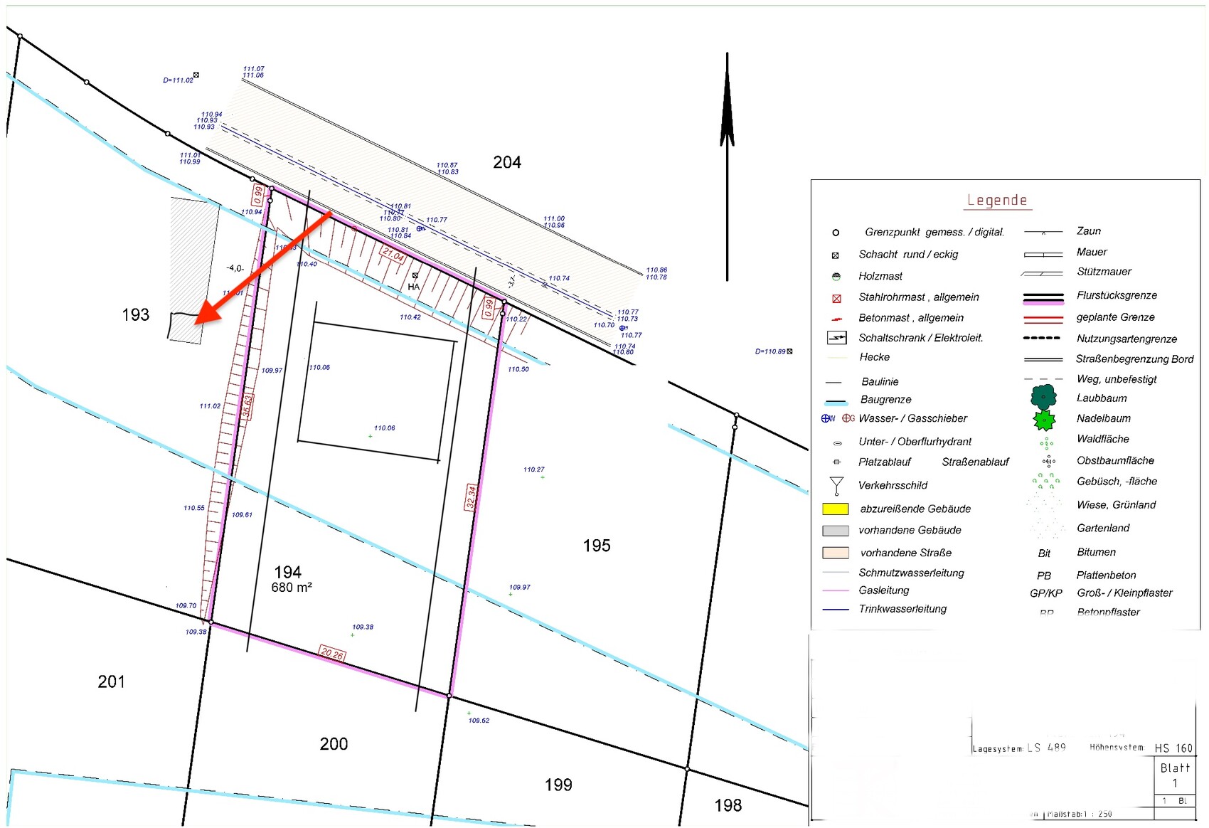 Lageplan mit Grundstücksgrenzen, Bauwerken, Legende rechts; roter Pfeil markiert Objekt