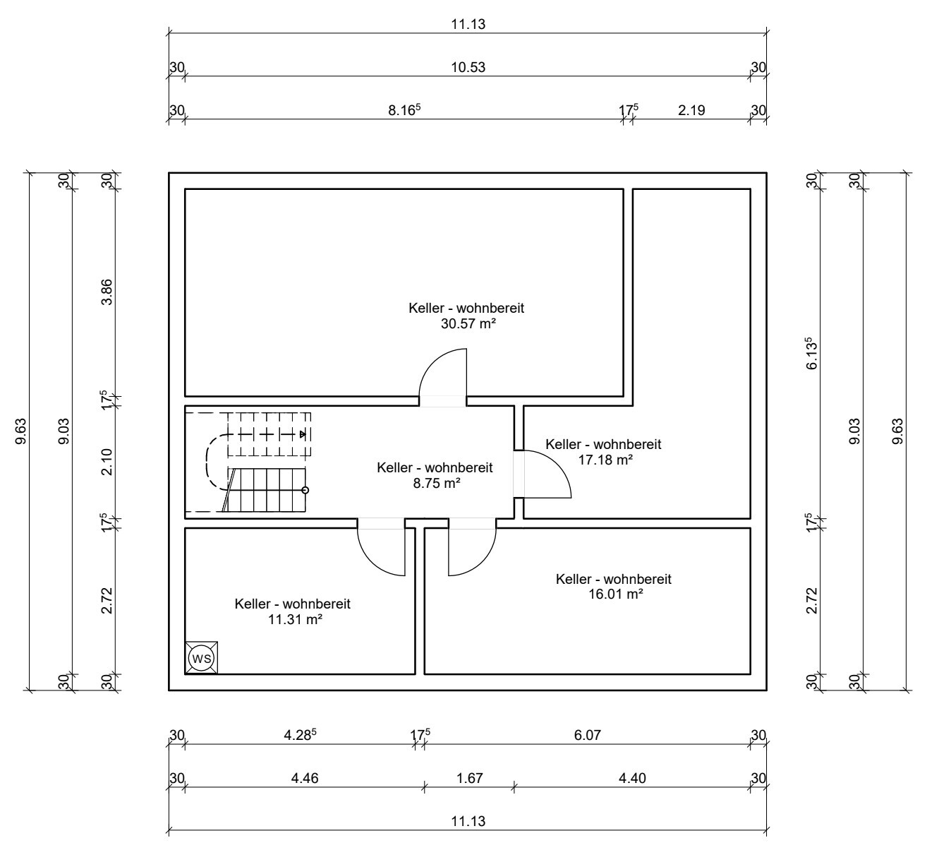Keller-Grundriss mit fünf wohnbereiten Räumen, Treppe, Türen und Flächenangaben (m²).