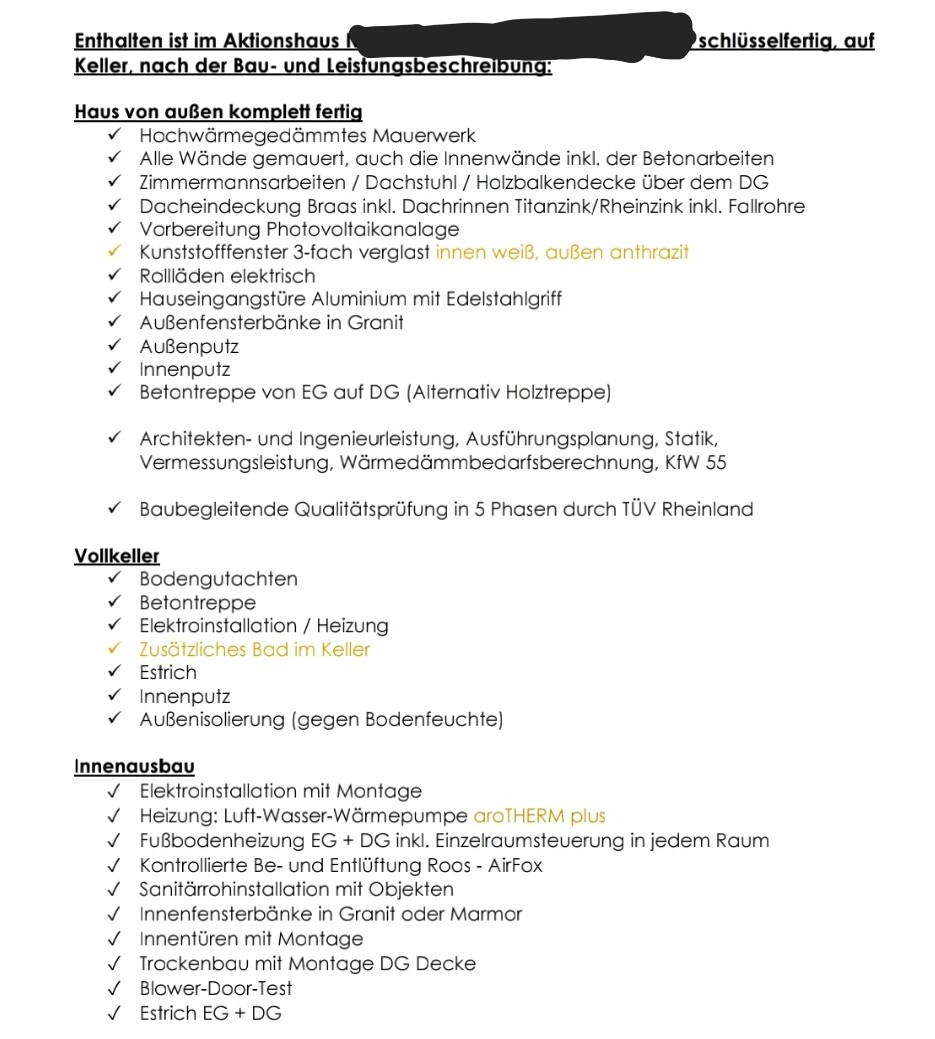 Die meisten Positionen sind gängig, andere hochwertiger als Durchschnittshäuser. Es sind auch ein paar bauseitige nötige Aufpreise dabei, die Du ja aber einkalkulierst.