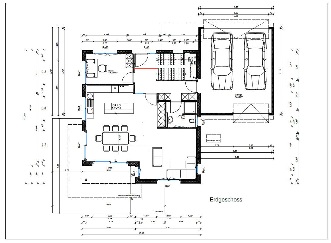 Würde es deinem rumprobieren entgegenkommen, wenn man die Voraussetzung der trennbaren Wohneinheit rausnimmt? Wir stehen einer anderen Treppenform ebenfalls offen gegenüber. Was wir dennoch unbedingt wollen, ist ein Windfang im Eingangsbereich - idealerweise direkt mit Garderobe. Man soll nicht direkt im Wohnraum/Küche stehen, sobald man das Haus betritt. Weiter wollen wir einen direkten Zugang von der Garage ins Haus, sowie ein Büro im EG beibehalten. Im Grunde sollte das Raumprogramm an sich, schon das beinhalten, wie es auch im Plan berücksichtigt ist. Auch was die Hausform angeht, sind wir eigentlich nur durch die Abstandsflächen limitiert.