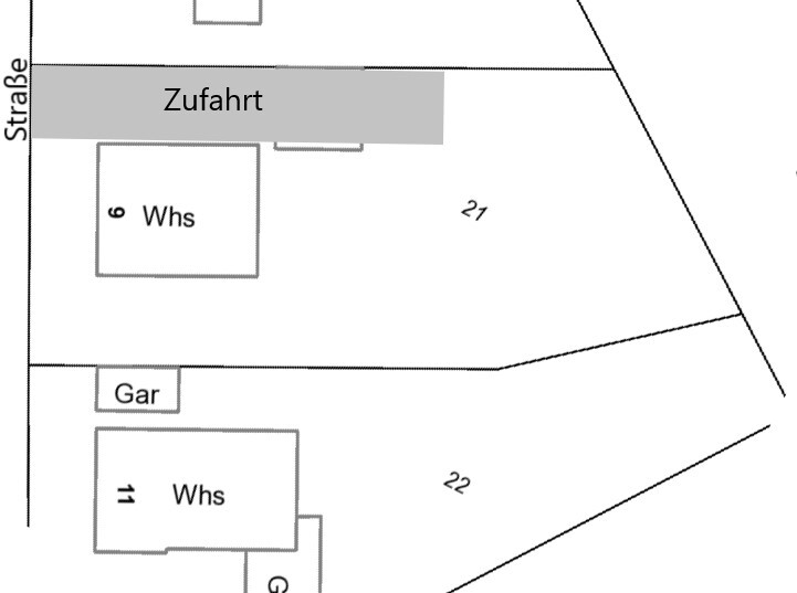 Lageplan: Straße links, graue Zufahrt, zwei Gebäude (Whs 6, 11), Garage, Parzellen 21/22.