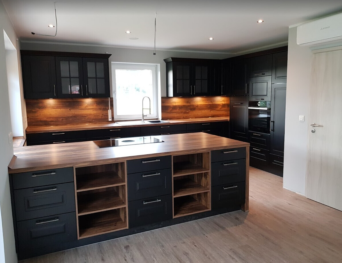 Moderne Küche mit schwarzen Schränken, Holz-Arbeitsplatten und Insel mit Kochfeld.