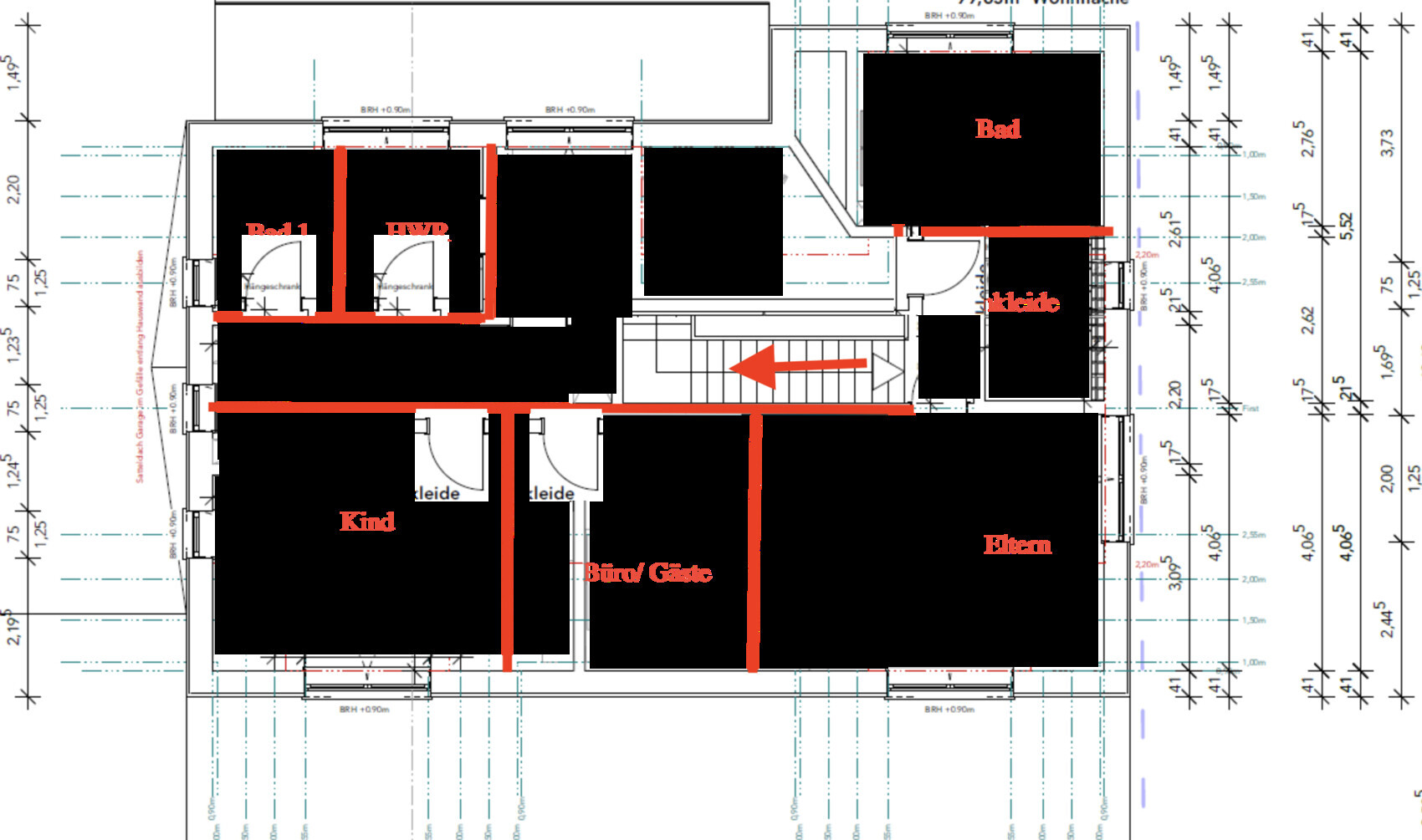 Das EG vom Architektenentwurf ist wenigstens logisch aufgebaut. Im OG hätte ich dann Kind mit Eltern getauscht und den Rest so gelassen. Dann hätte der Mann seinen kurzen Weg ins Bad. Vielleicht bekommt man sogar noch ein Kinderbad angeflanscht, dann hättet Ihr zwei Duschen.