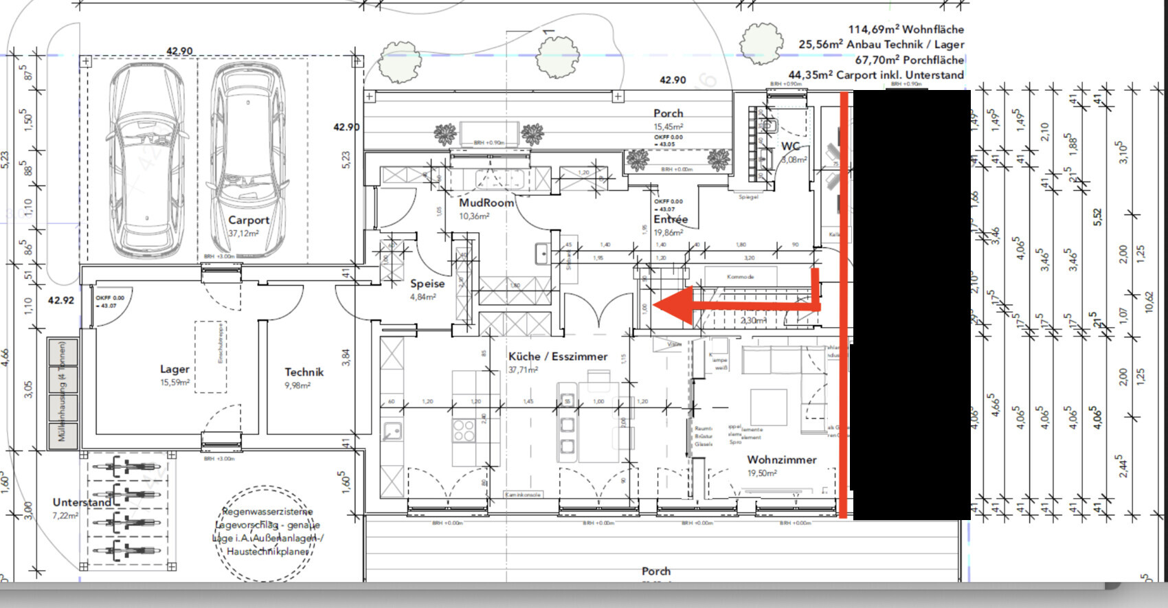 Der Technikraum soll da wirklich nur die Technik und vielleicht eine Schneeschaufel untergebracht werden. Viele haben dort noch den Werkzeugkoffer, die Ersatzbatterien und die Klebebänder gelagert. Die Türe Garage Technik sieht scher schmal aus.