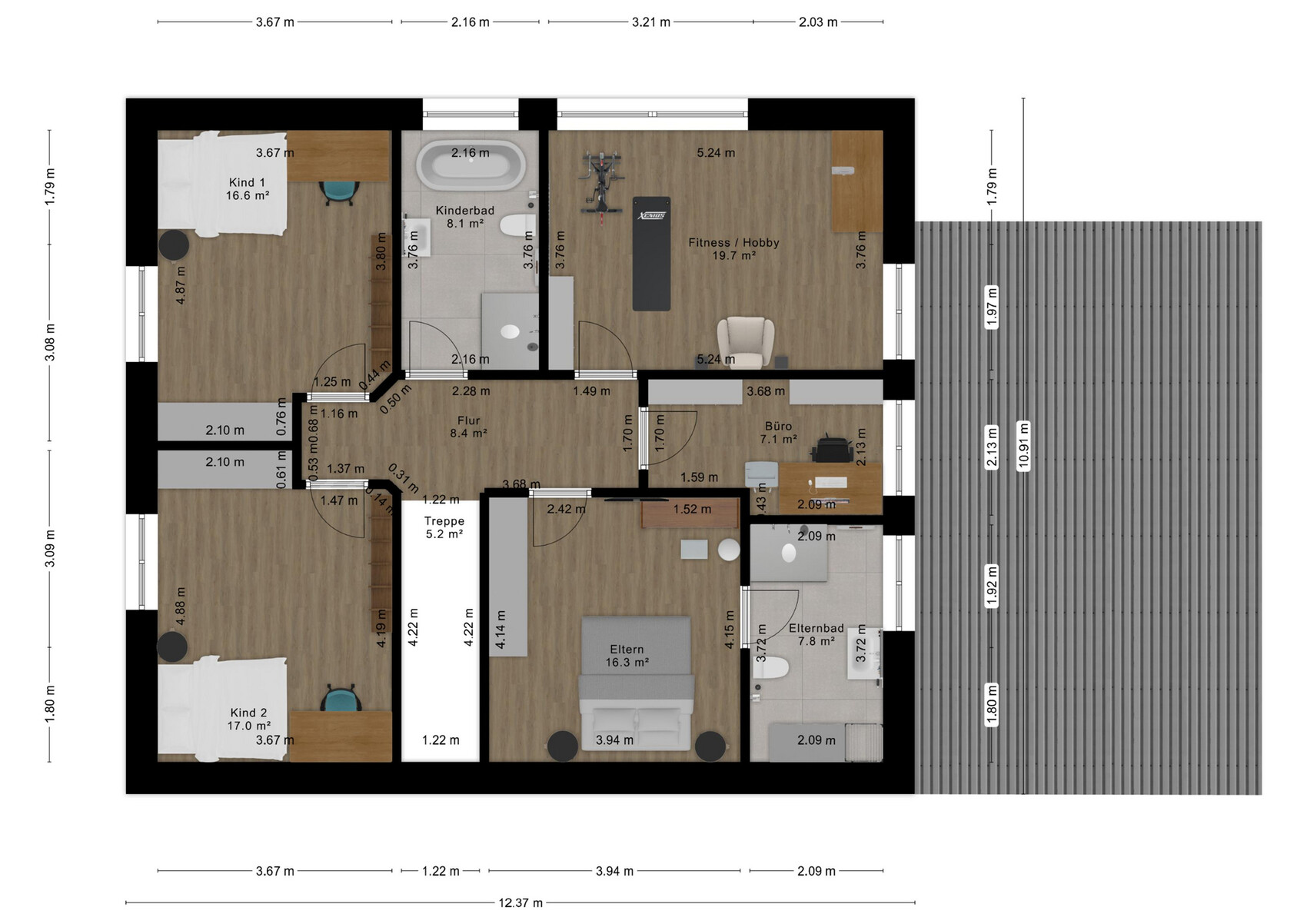 2D-Grundriss eines Hauses mit Schlafzimmern, Kinderzimmern, Bad, Fitnessraum und Terrasse