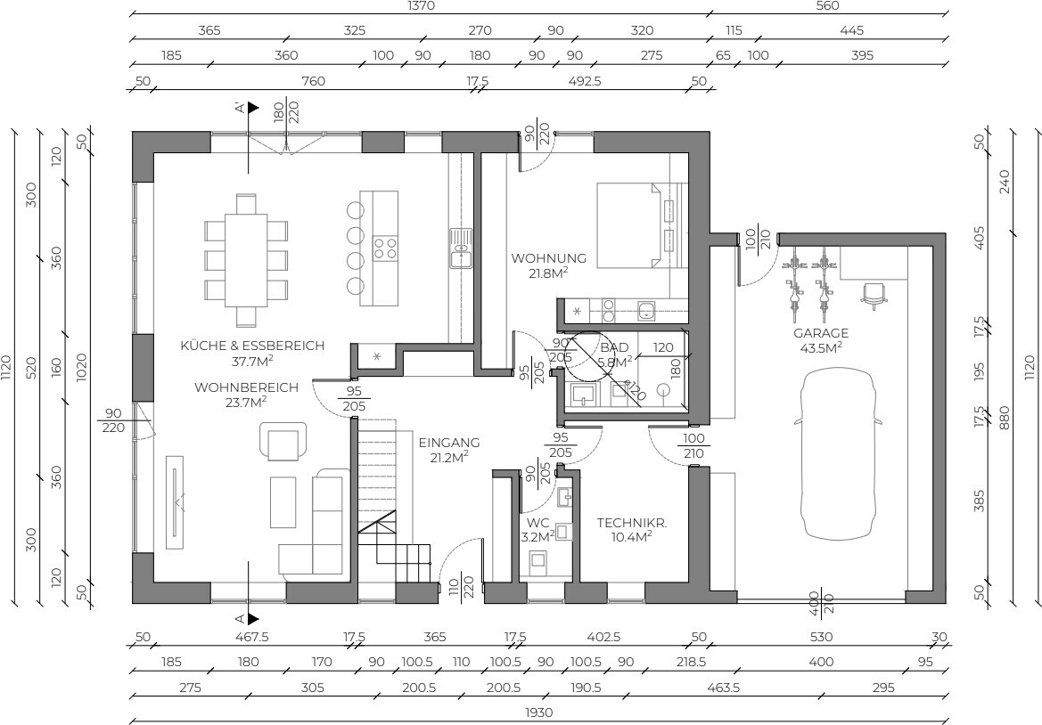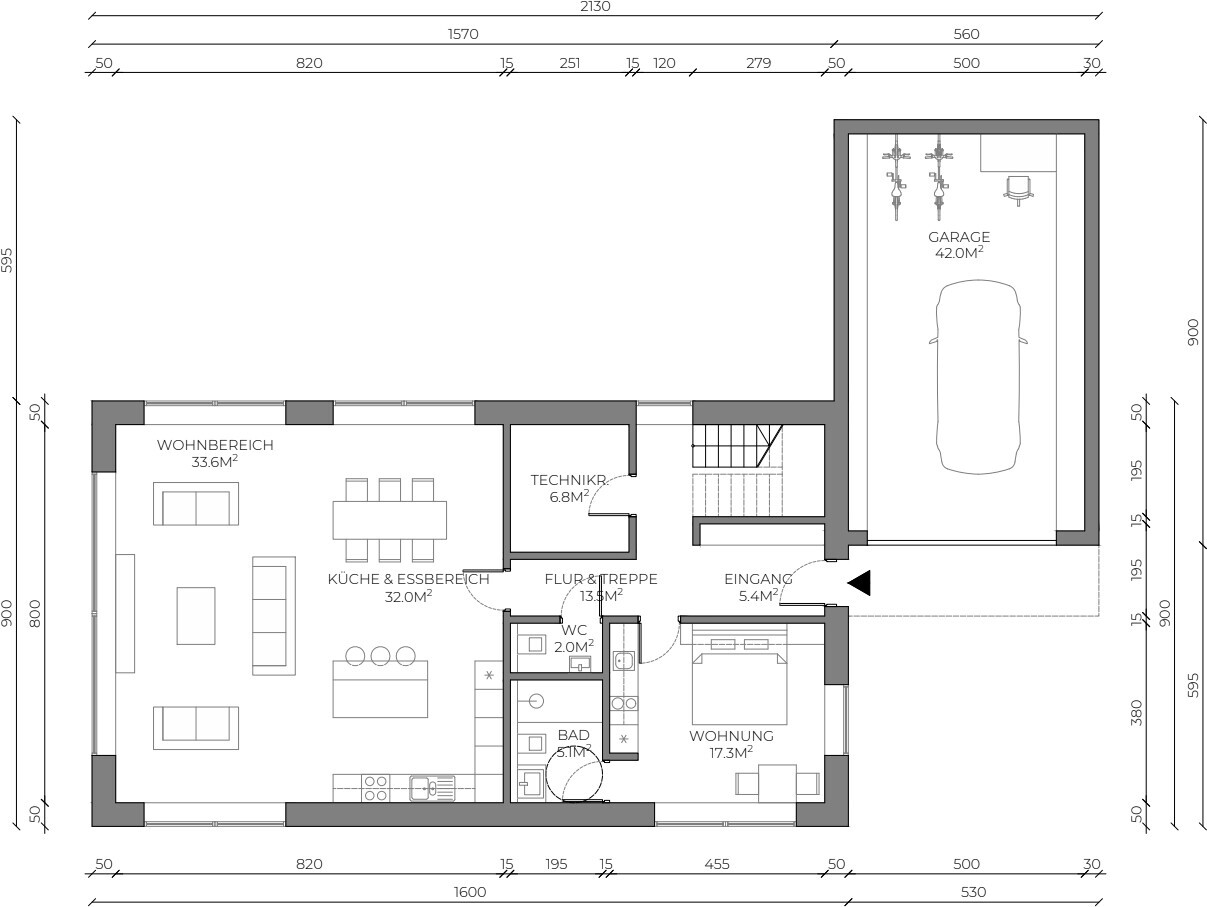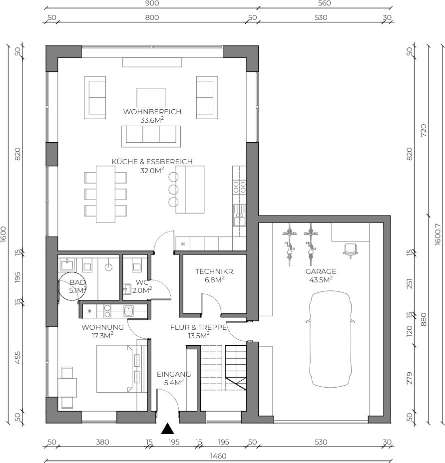 Grundriss einer Wohnung mit Küche/Essbereich, Wohnzimmer, Eingang, Bad, WC, Technikraum und Garage.