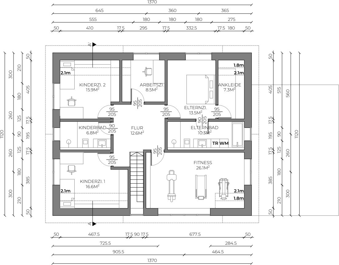 Grundriss: Flur verbindet Eltern mit Bad und Ankleide, zwei Kinderzimmer, Arbeitszimmer, Fitness.