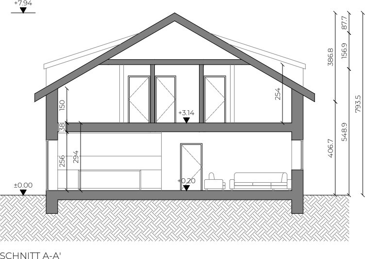 Querschnitt A-A' durch ein zweigeschossiges Haus mit Dachstuhl, Fenstern, Türen und Möbeln.
