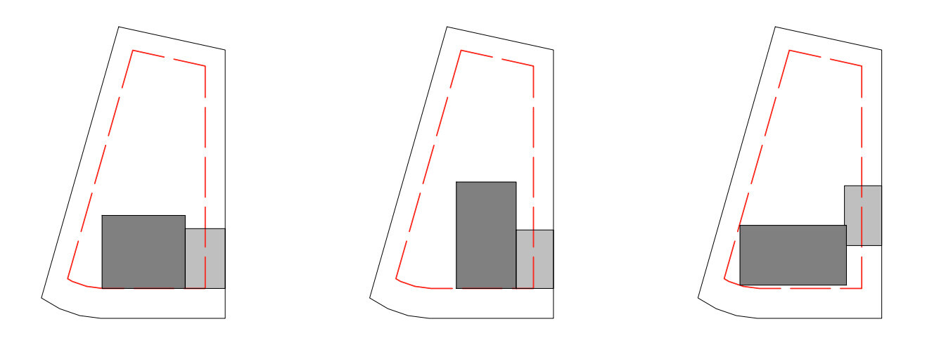 Drei Diagramme eines geneigten Grundrisses mit einer roten gestrichelten Linie und grauen Blöcken.