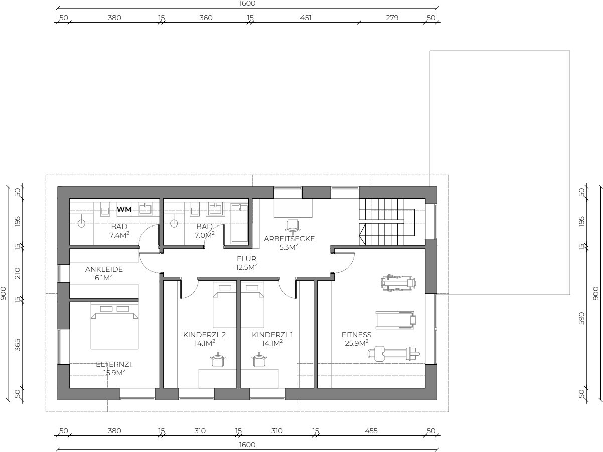 Grundriss eines Hauses: Elternzimmer, zwei Kinderzimmer, Fitnessraum, Flur, Bad, Ankleide.