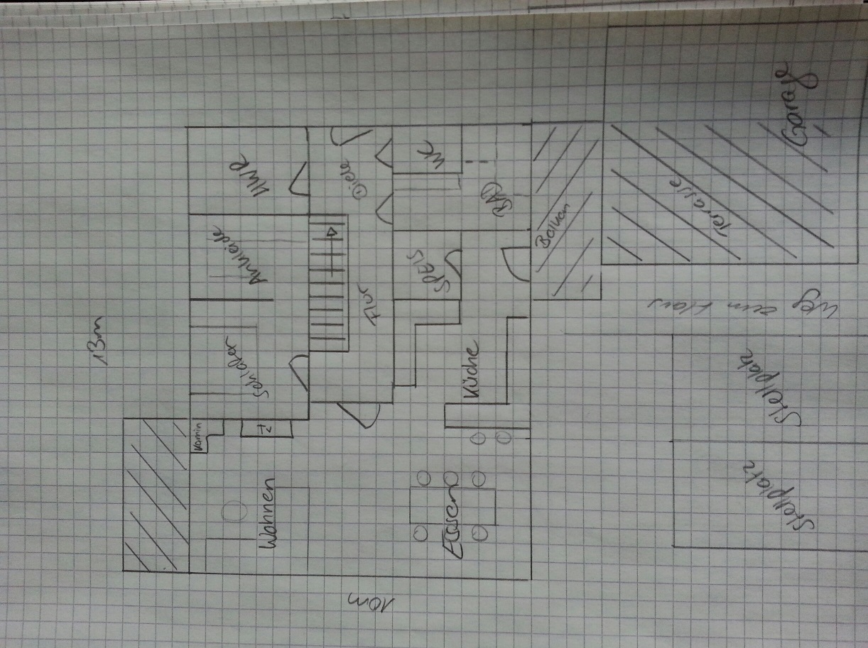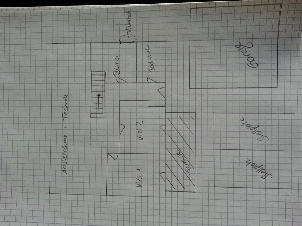 vielen Dank noch mal für euren Input. Wir haben uns jetzt mal selbst drangesetzt und etwas gezeichnet. Klar, ohne Wandstärken, das macht in den kleinen Räumen noch mal gut was aus. Aber eher so vom Gefühl (Türen, Fenster - alles noch nicht durchdacht)