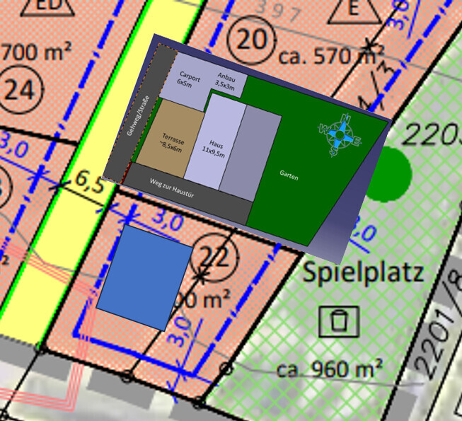 Stell mal bitte das ausgesuchte Grundstück ein. Dein Plan passt nicht in die #22. Ich habe jetzt keine Zeit den neuen Bebauungsplan zu suchen.