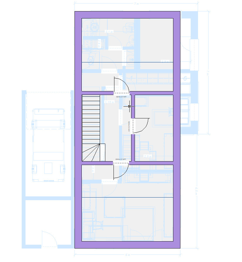 Im OG ist es eine wahre Befreiung für das Bad und auch für die Kinderzimmer. Hier schlagen 3,10m Badbreite die bisherigen 2,38m (!) um Längen und lassen einen Durchatmen. Auch das Kinderzimmer gewinnt von 2,61m auf die 2,90m, was das Raumgefühl normalisiert. Die gerade Treppe erlaubt, den Flur etwas schmaler zu machen, so dass beide Kinderzimmer den Effekt genießen.