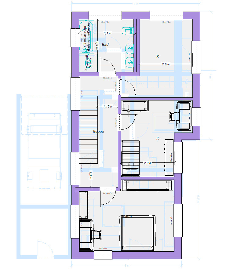 Im Dachgeschoss ändert sich wenig. Mangels Daten zum Kniestock hab ich das nur angedeutet.