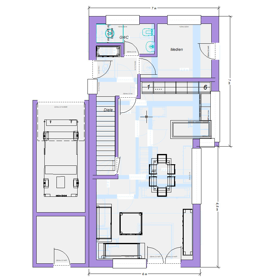 Im EG ist ganz entscheidend der Platzgewinn für die Küchenzeile. Mit 6 x 60er Standardschränken kann man was schönes planen. Im Ausgangsentwurf sind es nur magere 4.