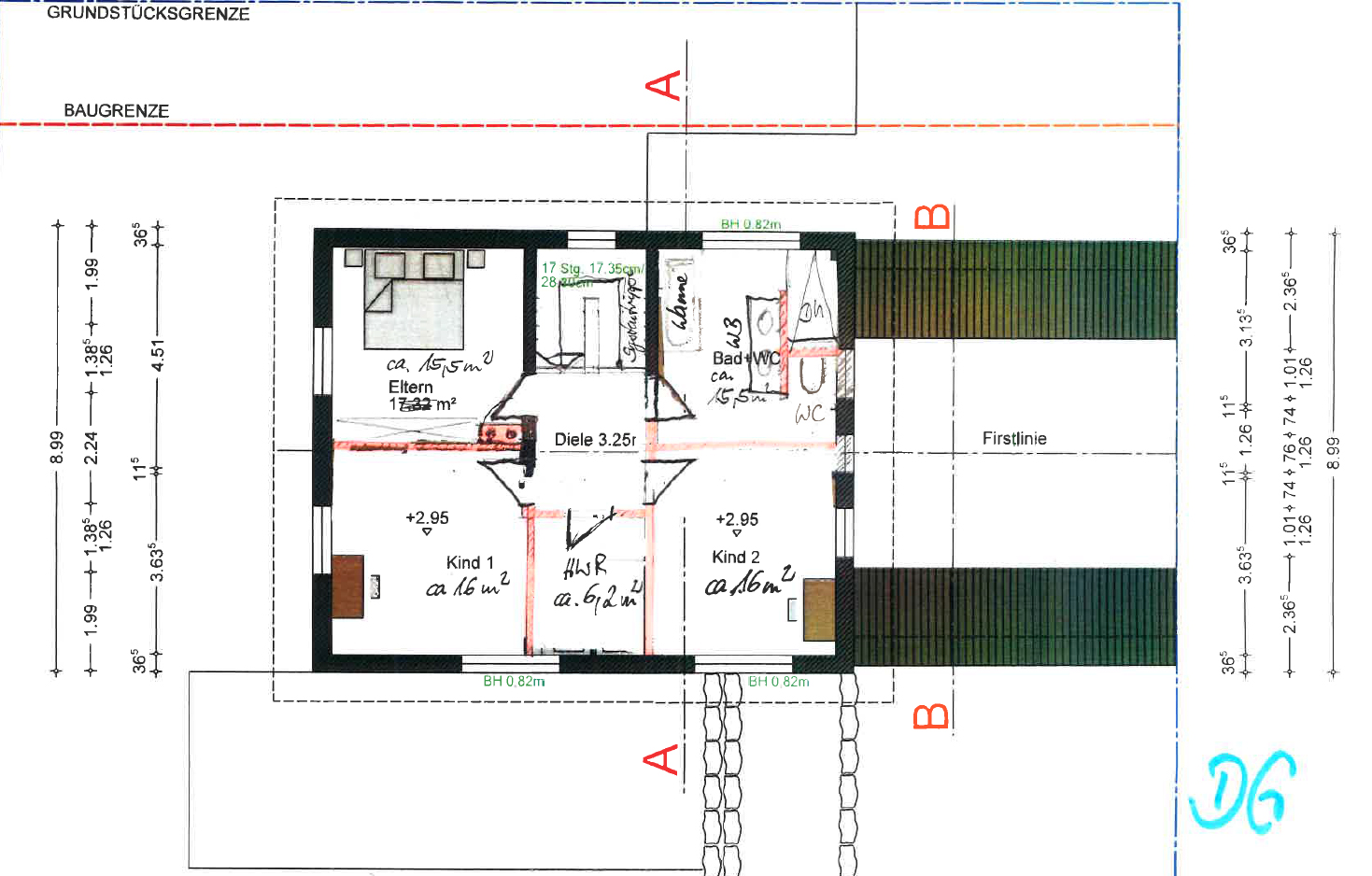 OG .. wo ist die 2m-Linie vom Dach? Ich fürchte, die Dusche ist so nicht zu betreten. Reicht der Kleiderschrank im Elternschlafzimmer?