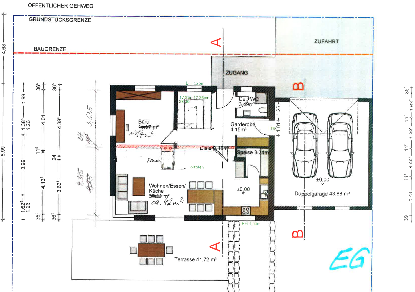 Dann kann sich das EG entsprechend entspannen, dass das WZ dort sein kann, wo jetzt das Büro ist. Der Kamin kann sich um 90 Grad drehen und der Esstisch kann sich entfalten.