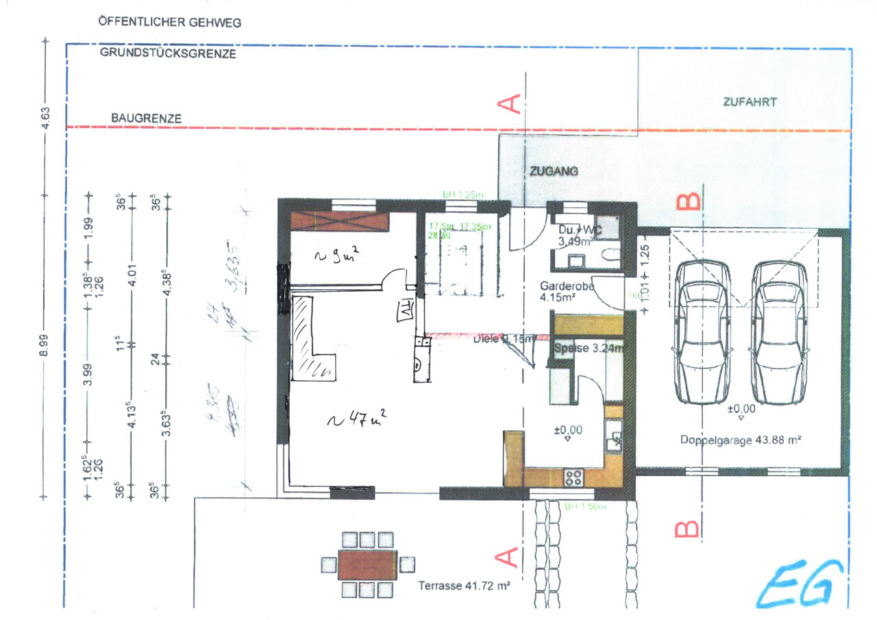 Hmm .. in EG4-neu ... da erhältst du planunterhalb des Wohnbereiches einen relativ schmalen (280?) breiten Bereich für den Esstisch. Ich finde es recht unpraktisch zur Möblierung. Vor allem, ein Esstisch wird immer irgendwie vor dem Terrassenzugang landen.
