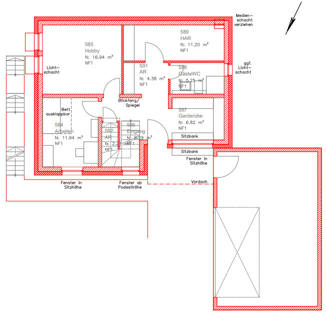 Die Einfahrt kann aufgrund bestehender Wasserleitungen nicht wie ursprünglich geplant umgesetzt werden. Stattdessen wird sie im Nordosten des Grundstücks realisiert.