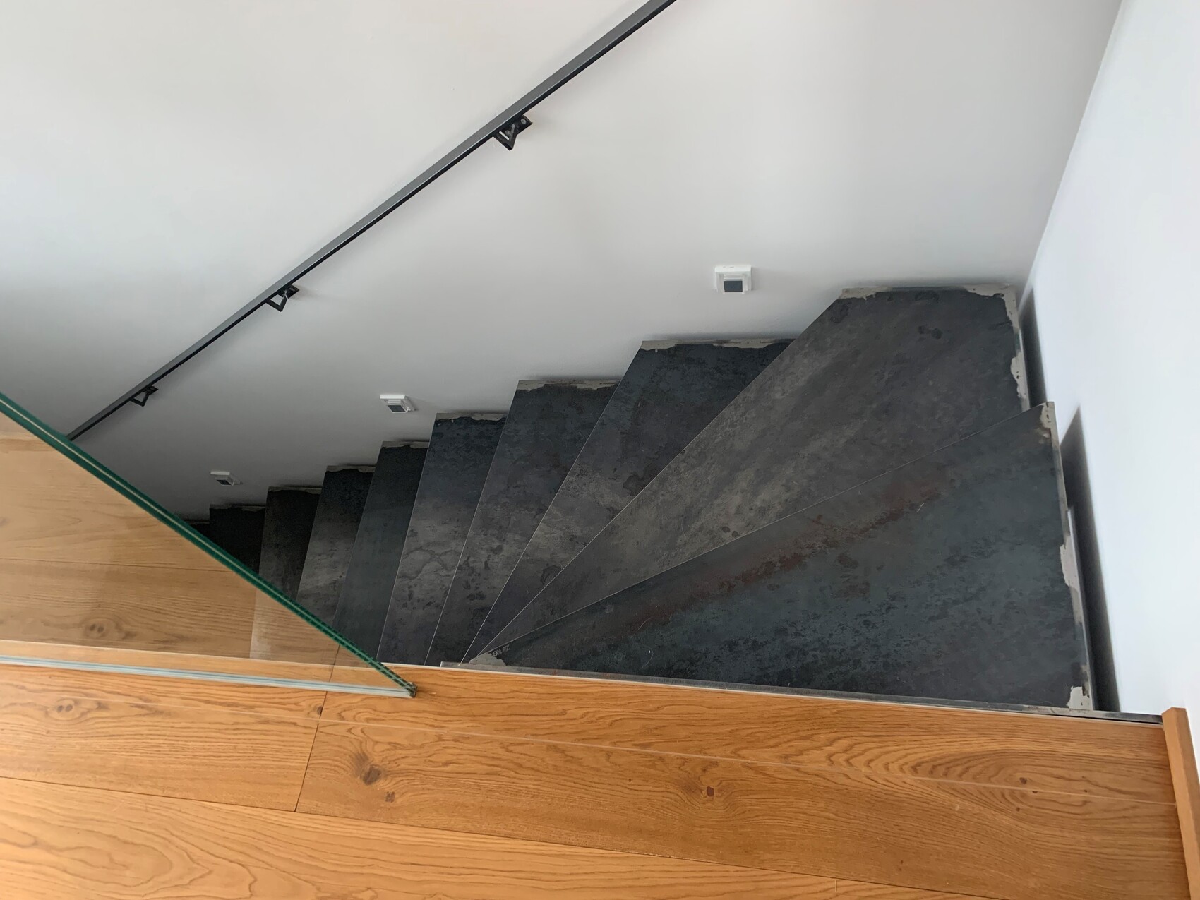 [ATTACH type="full" alt="Blick von oben auf eine dunkle Treppe aus Stein/Metall, links Glasgeländer, Holzboden am Rand.](https://www.hausbau-forum.de/attachments/71494/)
