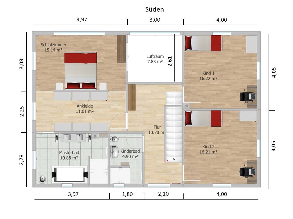 Ich kann jetzt noch verraten, was mir als erstes negativ aufgefallen ist: wenn man die Treppe herunter kommt, schaut man in der Flucht halb auf eine Wand, halb in die Garderobe. Und auch, wenn dort eine Tür vorkommen würde, würde mich das Bild stören. Entweder eine vollständig mittige geschlossene Wand oder eine bewusste Asymmetrie, aber nicht in eine Garderobe. Gleiches gilt für den oberen Treppenauftritt. Das kann man aber mit einer Stehlampe ausgleichen. Ein größerer Abstand zur Außenwand wäre besser. Das ganze (Treppe) wäre mir wichtiger als der Luftraum. Man darf auch nicht die Kraft der Sonne im Luftraum oben unterschätzen. Das wird kein Segen, das wird Fluch.Vielen Dank für den Tipp mit der Treppe, das war uns bislang nicht aufgefallen. Da wir eh lieber eine gerade Treppe bevorzugen, haben wir diese nun in die nächste Version gepackt. Es gäbe aber auch nach wie vor die Option, die Treppe zu drehen und auf den Luftraum zu verzichten, doch so gefällt es uns durch den offenen Charakter bisher besser. Das nicht ganz symmetrische Fenster am oberen Treppenauftritt stört uns nicht, da man es wie du vorgeschlagen durch ein Dekoelement ausgleichen kann.