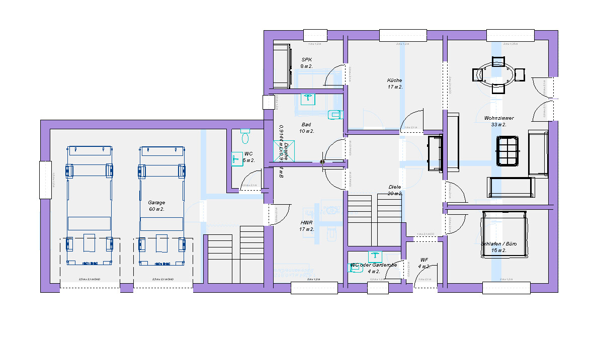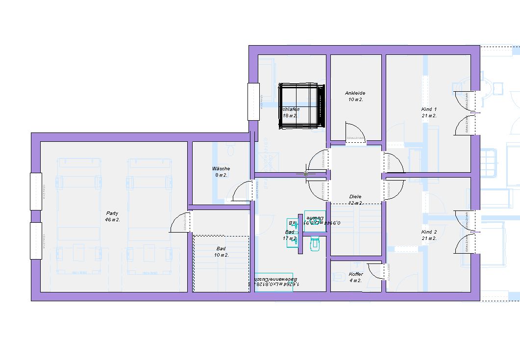 Die Quadratmeterzahlen sind leider recht ungenau. Das Programm misst immer von der Mitte der Wand! Ich habe mal 0,4m Außenwand und 0,2m Innenwände angenommen.