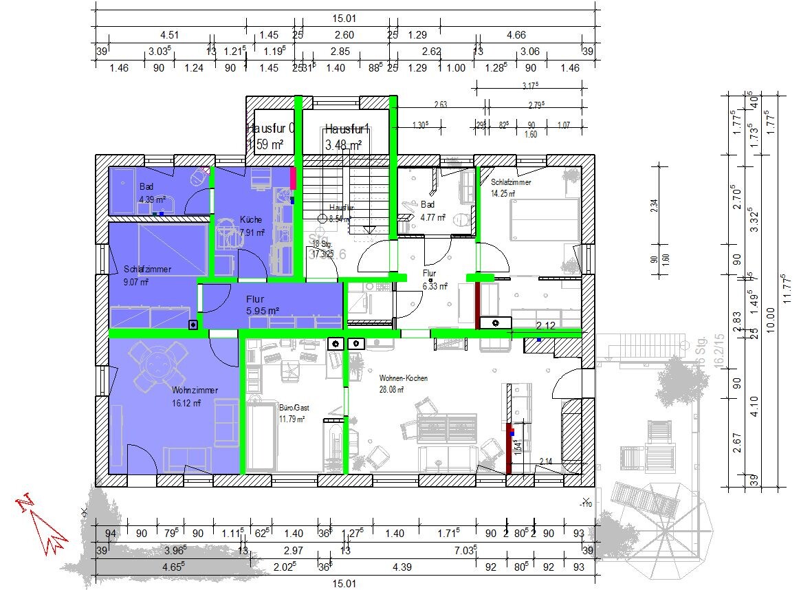 Problem ist nur, so ich die Garage zu klein. Und wenn sie größer wird, rutscht zwangsweise die Haustür nach unten, was mit dem Bad kollidiert.