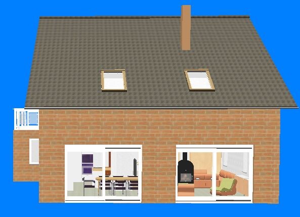 - Wohnzimmer jetzt riesig, zwar mit 2 kleinen Fenstern gen Osten, aber in der Hauptposition auf der Couch wird man mit dem Ostblick nicht belästigt. Dazu noch eine schöne Leseecke, der Kamin zentral. Große Süd/Westfront